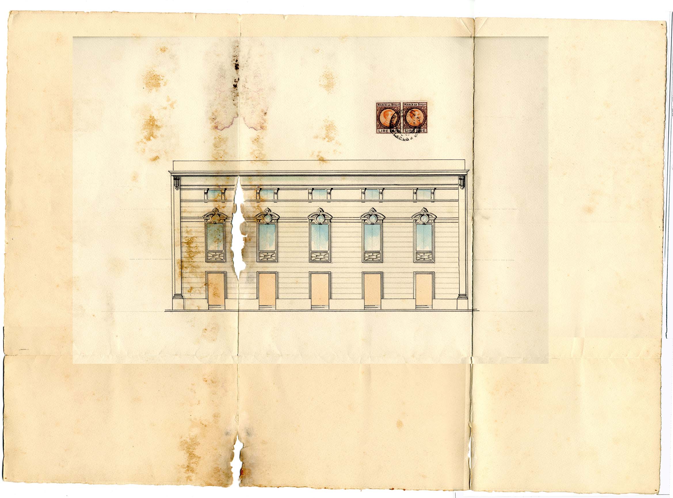 disegno su cartoncino; a china nera (le linee principali, parte delle ombreggiature), acquerellato in grigio (le stilature della muratura secondo un ritmo A – B); acquerellati con toni aranciati (i vani delle porte al piano terra) e azzurri (parti vetrate); acquerellato in grigio (le ombreggiature); a lapis (linee di costruzione). Sono presenti due marche da bollo uguali con il profilo di Vittorio Emanuele III° Re d’Italia, da Lire due con timbro circolare ad inchiostro nero, a stampatello maiuscolo, dell’”Ufficio del Registro Lecce”, la data nella parte centrale su tre righe è: “17 / … / 926”. Sul retro, manoscritto a matita rossa: “Prog(etto). orig(inale) 1911”.