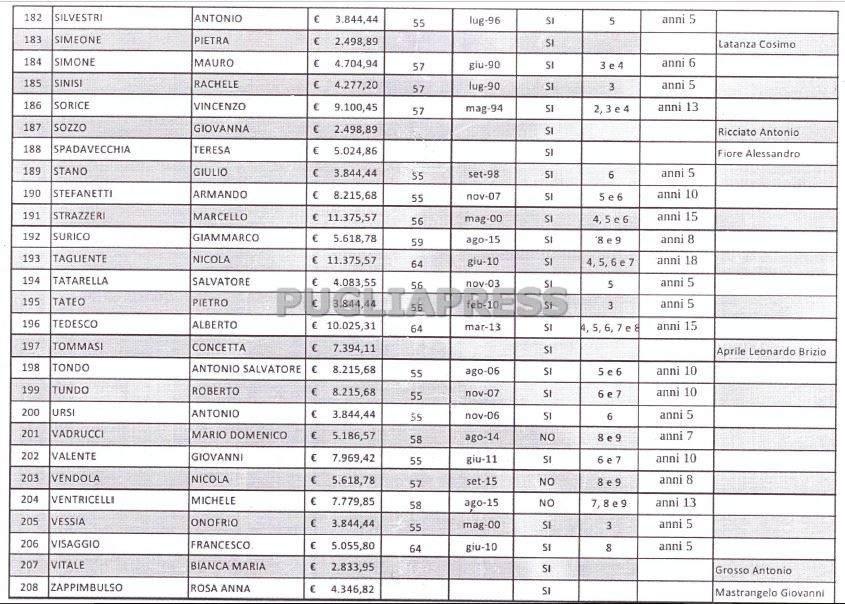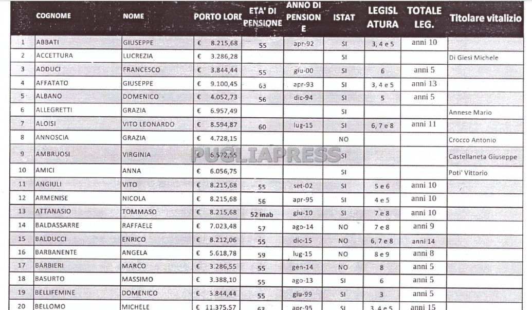 L’elenco completo dei 208 ex consiglieri della Regione Puglia che ottengono il vitalizio
