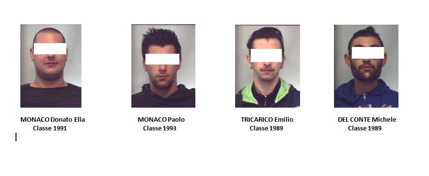 I Carabinieri della Compagnia di Vico del Gargano hanno tratto in arresto il venticinquenne MONACO Donato Elia, il ventitreenne MONACO Paolo e i ventisettenni DEL CONTE Michele e TRICARICO Emilio, con l’accusa di detenzione e porto illegale di arma da guerra in concorso.