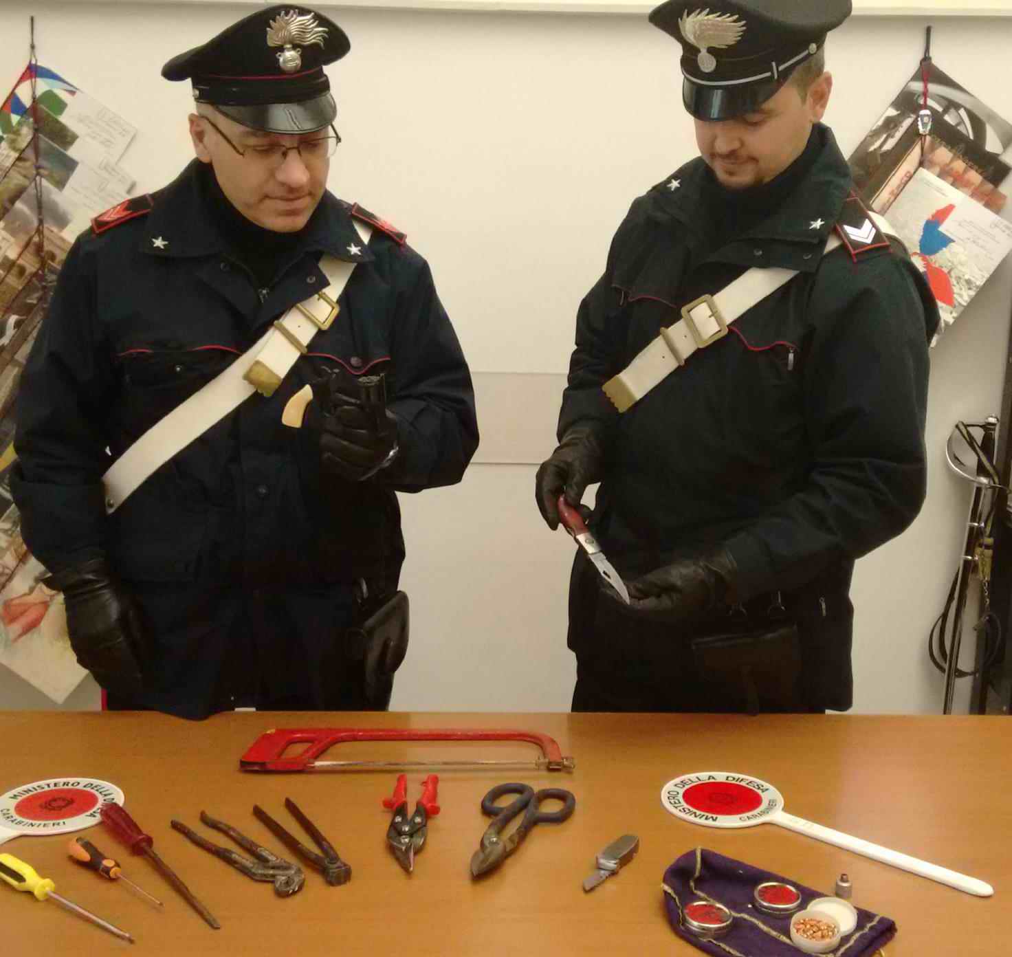 Il Pupillo, il Ruggiero ed il Roncade sono quindi stati portati al Comando Compagnia di Lucera per essere sottoposti agli accertamenti di rito e ad accurata perquisizione veicolare, all’esito della quale sono stati trovati pure in possesso di una pistola lanciarazzi cal. 22, in perfetto stato d’uso, due coltelli a serramanico della lunghezza di cm. 24 e cm. 12, e vari attrezzi atto allo scasso, occultati nel vano porta oggetti e nel portabagagli.