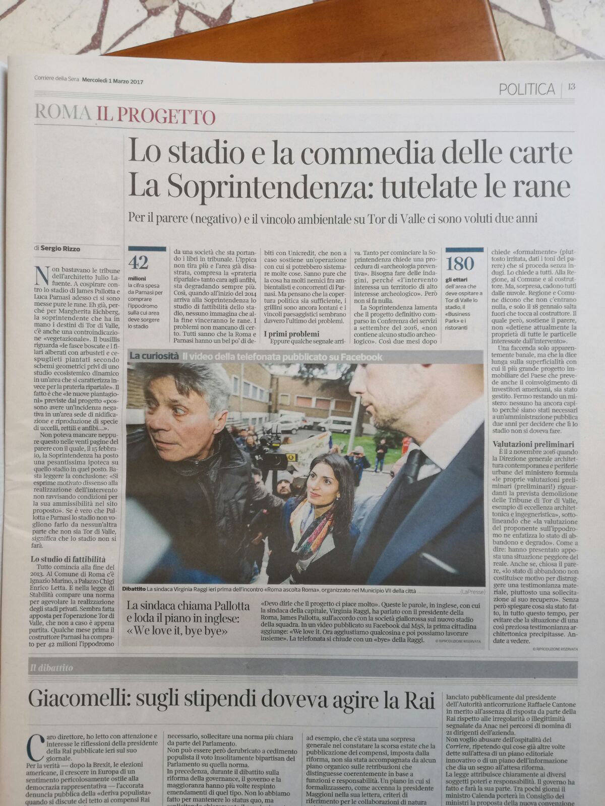 Che la questione dello stadio per la Roma sia tutt’altro che conclusa e risolta lo dimostra un articolo a firma di Sergio Rizzo sulle pagine del Corriere della Sera del 1 Marzo 2017 intitolato: “Lo stadio e la commedia delle carte. La Soprintendenza: tutelate le rane”. Il titolo parla da solo e la posizione del noto giornalista appare indiscutibilmente contro la Soprintendenza di Roma e quindi anche contro la decisione di quest’ultima di avviare l’iter [percorso] per l’imposizione del vincolo sulle strutture principali costituenti l’ippodromo di Tor di Valle destinate ad essere distrutte per la costruzione dello stadio. Di fatto, secondo lo stile Las Vegas delle più rutilanti performance del Divino Otelma, si fa apparire molto discutibile il comportamento della Soprintendenza della quale si ride a causa della tutela delle rane. Ciò facendo però si nasconde in effetti «il dietro le quinte» ovvero il delegittimare un ben più importante parere, quello di tutela delle tribune. Se la Soprintendenza indica la Luna può anche capitare che qualcuno guardi il dito. La nostra fortuna è di appartenere ad una categoria, quella degli studiosi di Storia, per i quali l’autorevolezza indotta dell’ipse dixit [Egli ha detto] ha valore nullo sempre; a maggior ragione non esiste quella dedotta. Il fatto che S. Rizzo, in sostanza, sia stato l’autore di importanti inchieste, anche condivisibili, non ci mette nella condizione di considerare tutto ciò che esce dalla sua penna (anche quando pubblicato su una prestigiosa testata nazionale) come oro liquido, una sorta di vangelo.
