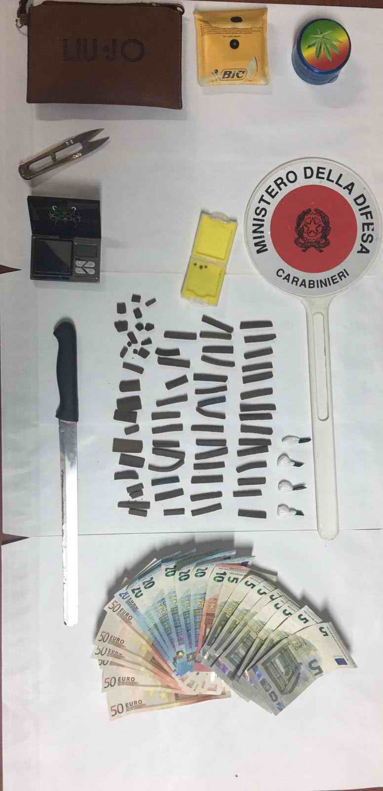 Il primo arresto è stato eseguito a Foggia, lungo Corso Roma. I militari, nel corso del controllo di una Peugeot 206 condotta da FORLEO Gianluigi, classe ’89 di Foggia, insospettitisi per l’anomalo comportamento del giovane, che si mostrava inspiegabilmente teso, hanno deciso di procedere a un’accurata perquisizione del soggetto, che ha permesso di trovargli addosso 5 “stecche” di hashish, della stessa quantità e dimensioni, per un totale di 40 grammi circa, nonché banconote di piccolo taglio. La perquisizione è quindi stata estesa all’abitazione del giovane, dove è stato rinvenuto il materiale necessario al confezionamento dello stupefacente, costituito da involucri di plastica, un taglierino ancora sporco della sostanza stupefacente e un bilancino di precisione, oltre ad altre banconote di piccolo taglio per un totale di 300 Euro. A seguito dell’avvenuta convalida, il Forleo è stato dapprima posto ai domiciliari, e poi, per il suo stato di incensurato, rimesso in libertà.