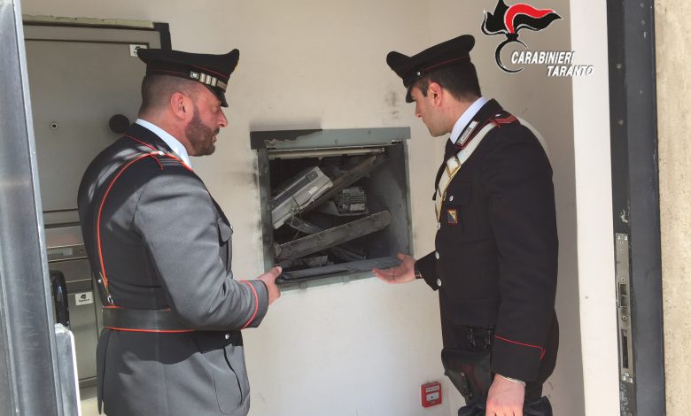 Questa mattina alle ore 04.20 circa, in Palagianello, ignoti, dopo aver introdotto nella feritoia di erogazione banconote ed azionato una micro carica esplosiva, comunemente denominata “marmotta”, hanno fatto esplodere lo sportello bancomat di un istituto di credito ubicato in quella via Carducci. L’azione criminosa non aveva ulteriori conseguenze ed i malviventi non riuscivano ad impossessarsi dei quasi 40mila euro contenuti, verosimilmente anche a seguito del tempestivo intervento di una pattuglia della locale stazione carabinieri e di una seconda dell’Aliquota Radiomobile della Compagnia di Castellaneta, impegnate in mirati servizi di prevenzione e repressione dei reati, che giungevano prontamente sul posto. I rilievi sono stati eseguiti da personale artificieri del nucleo investigativo del reparto operativo del Comando Provinciale di Taranto, che hanno repertato il manufatto impiegato.