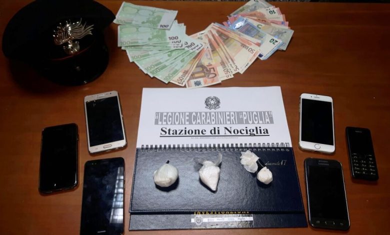 Intorno alle 16.30 ieri pomeriggio i due, a bordo di una Volkswagen Golf nera, si sarebbero recati a Nociglia per cedere sostanza stupefacente ad un noto professionista nocigliese. I due giovani, stante l’atteggiamento sospetto, considerando che non erano mai stati notati nel comune, e che erano appena usciti dall’abitazione del professionista sopra citato, sarebbero stati prontamente controllati dai militari della Stazione di Nociglia, e visti i numerosi precedenti specifici, sono stati sottoposti a perquisizione personale e veicolare. L’esito sarebbe stato positivo in quanto sarebbero stati trovati in possesso di circa 2200 euro in contanti che i Carabinieri hanno ritenuto fossero provento della pregressa attività di spaccio. Infatti la successiva perquisizione nell’abitazione del libero professionista avrebbe fatto emergere il ritrovamento e sequestro di circa 30 grammi di sostanza stupefacente del tipo cocaina suddivisi in 4 involucri appena acquistata dai due fermati.
