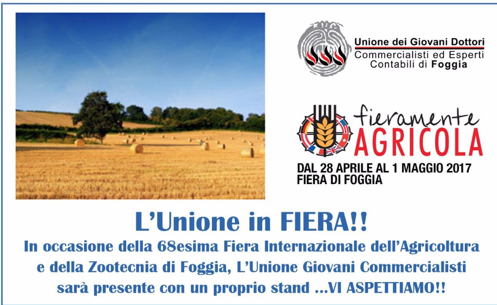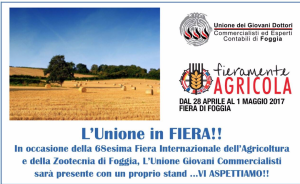 Realizzare un progetto pilota che mette in comunicazione il mondo dell’agricoltura con quello dei dottori commercialisti. E’ la nuova mission dei membri dell’UGDCEC – Unione Giovani Dottori Commercialisti ed Esperti Contabili di Foggia che quest’anno hanno scelto di essere presenti, per la prima volta assoluta in Italia, con un proprio stand nell’ambito della ‘68ma Fiera Internazionale dell’Agricoltura e della Zootecnia’, in programma nel quartiere fieristico dauno da domani e fino al prossimo primo maggio.