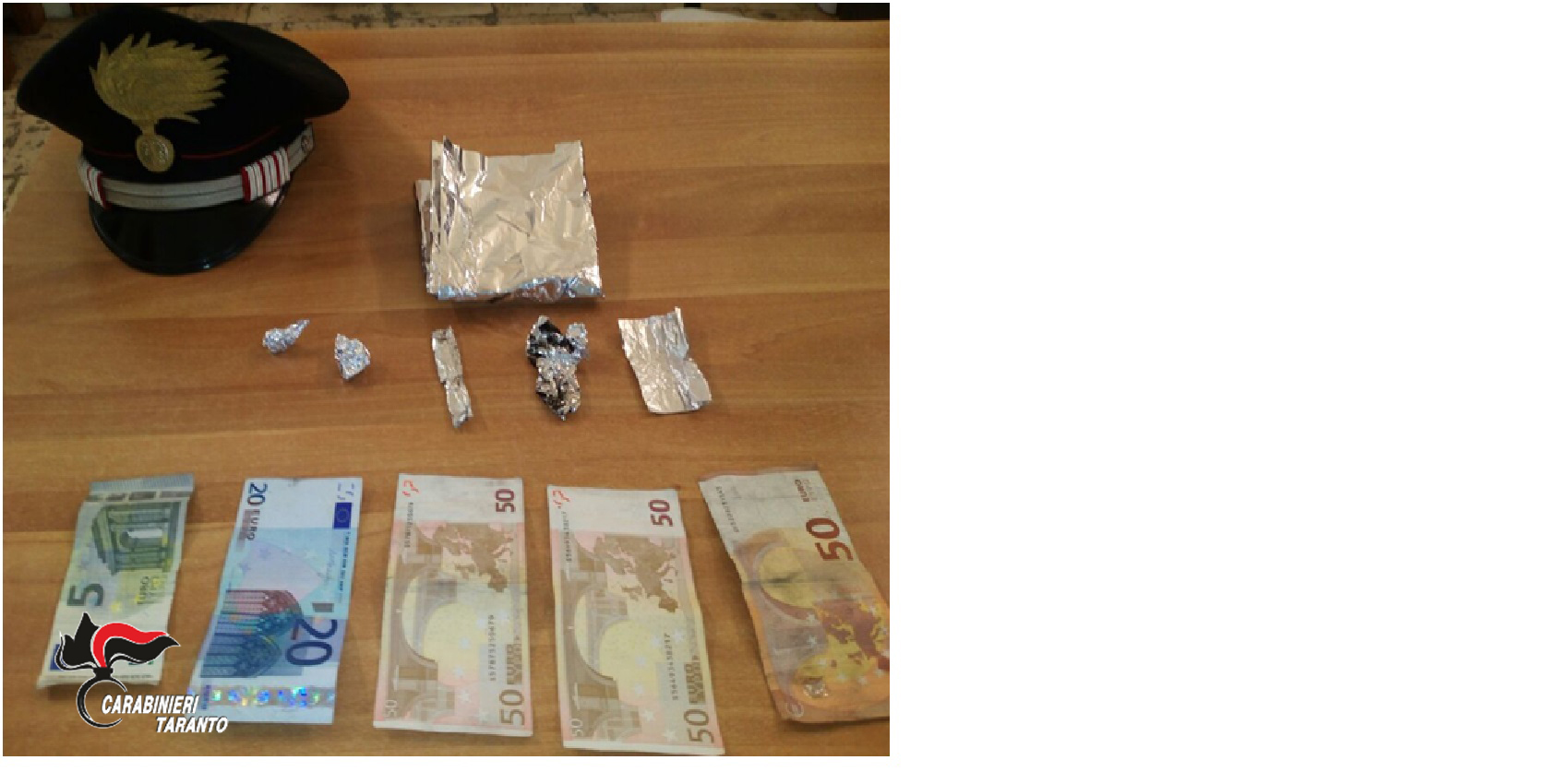 Il denaro rinvenuto, ritenuto provento dell’attività di spaccio sino a quel momento posta in essere, veniva sottoposto a sequestro unitamente allo stupefacente che verrà inviato al Laboratorio Analisi Sostanze Stupefacenti del Reparto Operativo del Comando Provinciale Carabinieri di Taranto per gli accertamenti tecnici-qualitativi.
