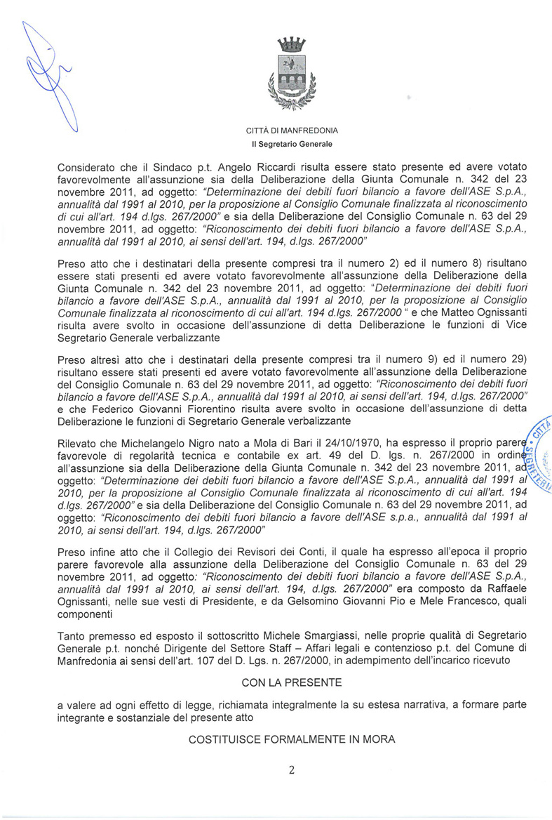 In data odierna è stato notificato, ad amministratori comunali della passata consiliatura, un atto di