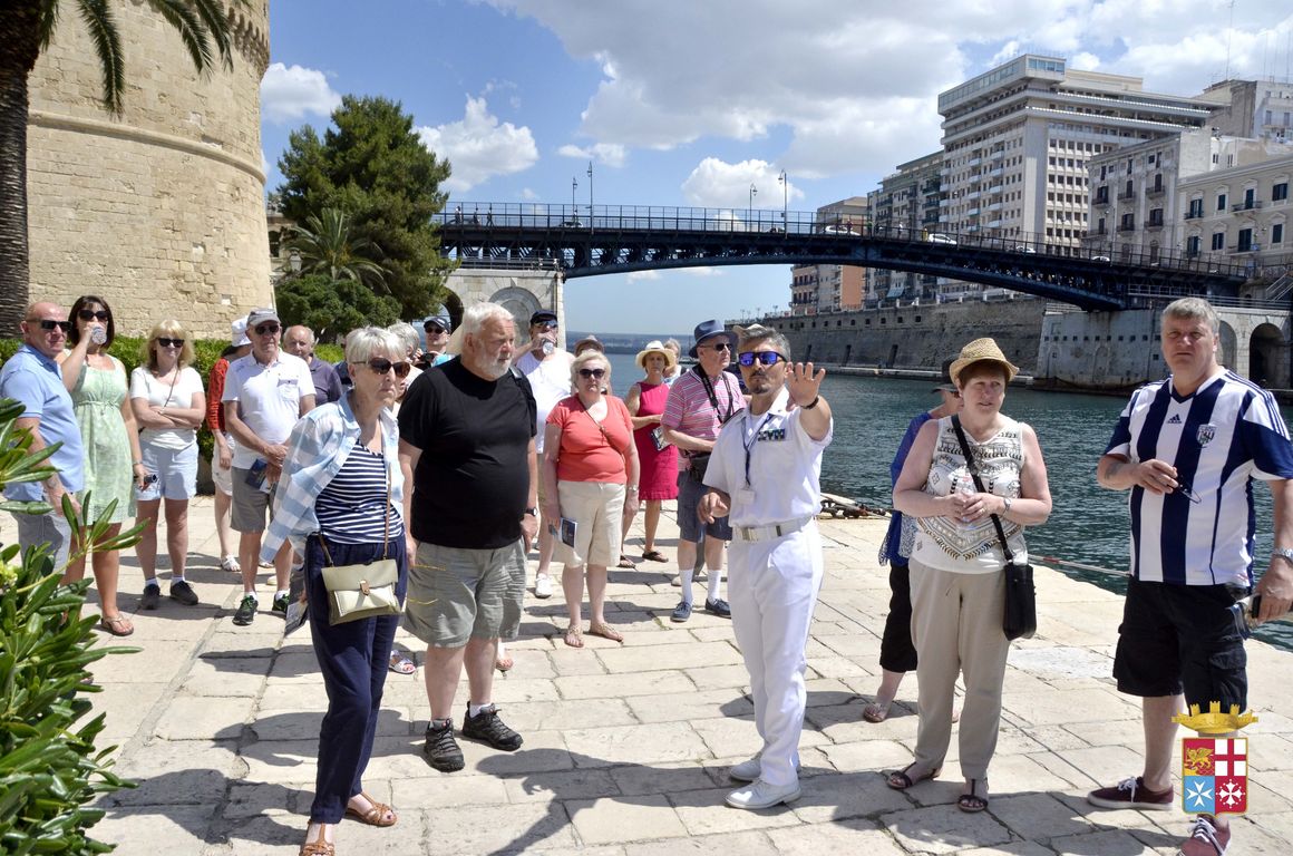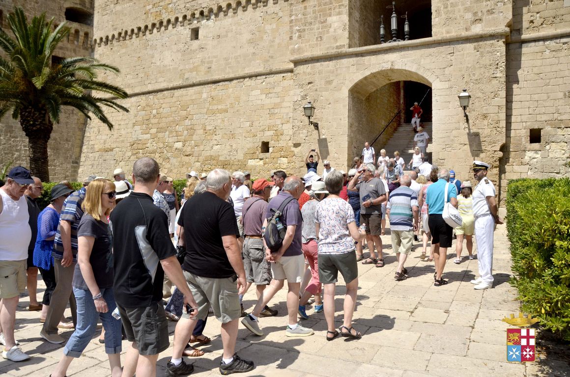 I giorni 15 e 29 maggio il Castello Aragonese di Taranto, di cui la Marina Militare è responsabile attraverso il Comando Marittimo Sud, ha visto un vero “boom” di turisti. Tra questi 1232 passeggeri (589 il giorno 15 e 643 il giorno 29) di una nave da crociera in sosta nella città che hanno deciso di dedicare una parte della loro giornata alla visita del Castello.