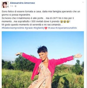 “Scrivono che il matrimonio è alle porte- fa sapere direttamente la cantante salentina sul suo profilo Facebook- ma di chi?! Non il mio per il momento” Poi la stoccata esilarante: “ma soprattutto i 500 invitati dove li prendo.”