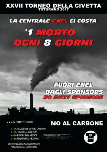 “La Centrale Enel ci costa 1 morto ogni 8 giorni. Fuori Enel dagli sponsor”. E’ quanto scritto su alcuni manifesti spuntati oggi a Tuturano, in vista dell’inaugurazione del popolare Torneo della Civetta. I manifesti a firma del movimento No Al Carbone puntano il dito contro Enel, main sponsor dell’evento.