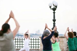 La rotonda del Lungomare si veste dei colorati tappetini da yoga delle donne presenti all’evento, che con grande concentrazione seguono i movimenti dell’insegnante, e rivolgono lo sguardo al Mare, con le navi in lontananza e il sole che sorge.