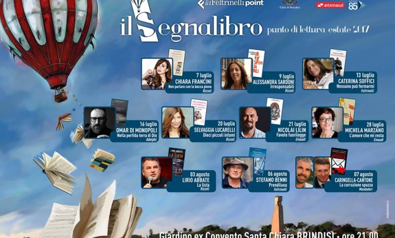 Dieci appuntamenti dal 7 luglio al 7 agosto presso il Giardino dell’ex convento Santa Chiara a Brindisi (nei pressi del Duomo) con inizio alle ore 21.00. Torna “il Segnalibro – punto di lettura Estate 2017” la prestigiosa rassegna letteraria organizzata da La Feltrinelli point Brindisi con il patrocinio del Comune di Brindisi e grazie alla sensibilità di Discovery Brindisi – Caffè Fadi – Rotary club Brindisi – Fondazione Tonino Di Giulio – Ordine Architetti Brindisi – Automondo srl Peugeot – Grande Albergo Internazionale – Piazzetta Colonne ristorante – Titi Shipping – Tenute Rubino – Palazzo Virgilio. Media partner : Antenna Sud e Canale 85.
