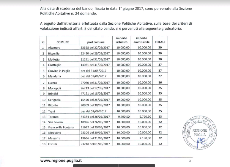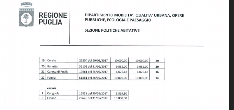 Tra le 24 domande arrivate in Regione Puglia c’è anche quella del Comune di Barletta, ma occorre evidenziare che almeno per quest’anno, non un euro dei 10mila previsti arriverà nelle “casse comunali”, perché nella graduatoria Barletta si è collocata al 20smo posto!