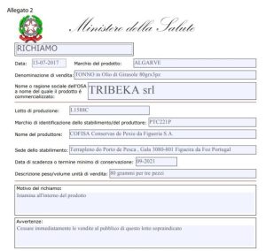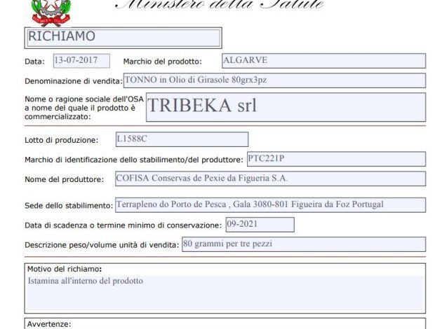 Il Ministero della Salute con una nota ha informato cessare immediatamente la vendita di confezioni di tonno all’olio di girasole Algarve, prodotti da Tribeka Srl.