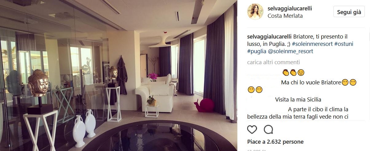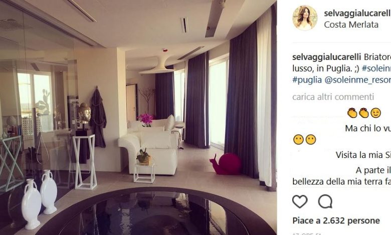 La mordace Selvaggia Lucarelli, opinionista, giornalista per il Fatto e nota blogger, è approdata in Puglia nei giorni scorsi, risiedendo tra Brindisi e Ostuni per presentare, prima nel capoluogo brindisino e poi nella bellissima città bianca, la sua ultima fatica letteraria, edita da Rizzoli, “Dieci piccoli infami”. Tra una performance editoriale e l’altra però, nelle zone di Ostuni, la nota scrittrice non ha rinunciato a godersi le bellezze della terra del sole, alloggiando insieme a suo figlio Leon e al compagno in un resort da sogno, il “Sole in Me Resort”, una struttura lussuosissima affacciata sul mare, con ambienti unici e arredati con fine gusto, rimanendone estasiata tanto da postare su Instagram la foto di uno dei living della struttura con un commento ad hoc dedicato all’imprenditore Flavio Briatore.