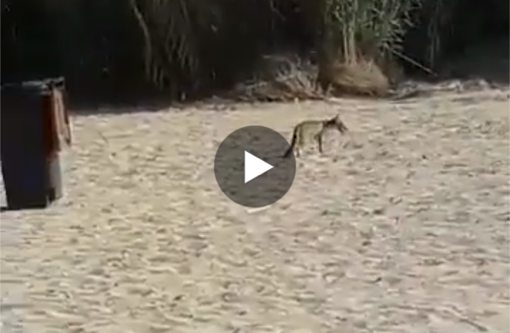 L’animale appare disorientato e sembra essere denutrito e alla vista dei tanti bagnanti, dopo pochi attimi, fugge per nascondersi, riparandosi nelle frasche.