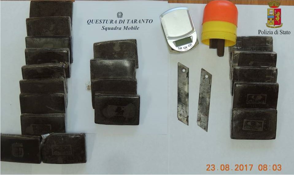 Nello stesso deposito i poliziotti avrebbero rinvenuto ed aperto un bauletto portaoggetti per scooter, al cui interno sarebbero stati custoditi confezione integra, 15 panetti di hashish del peso di 100 grammi ciascuno.