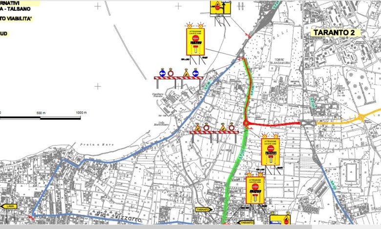 La stessa disposizione indica un apposito grafico, che si allega, i percorsi alternativi per gli automobilisti che da Lama saranno diretti verso Taranto e viceversa.