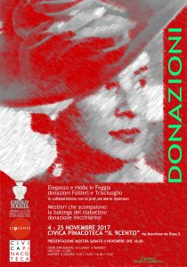 Elementi di vestiario elegante risalente agli anni ‘50 e ‘60 del secolo scorso, di sapiente manifattura locale, e un quadro di Harry Jelinek (donazione Follieri), un prezioso grembiulone da battesimo dell’Ottocento ed un santo sotto campana (donazione Trisciuoglio), gli attrezzi di una vecchia bottega di ciabattino (la bottega di “zi Felucce”, donazione Vecchiarino), sono esposti per la durata della mostra, fino al 25 novembre, nella cornice della Pinacoteca il 9cento, vocata per definizione ad accogliere testimonianze del secolo scorso.