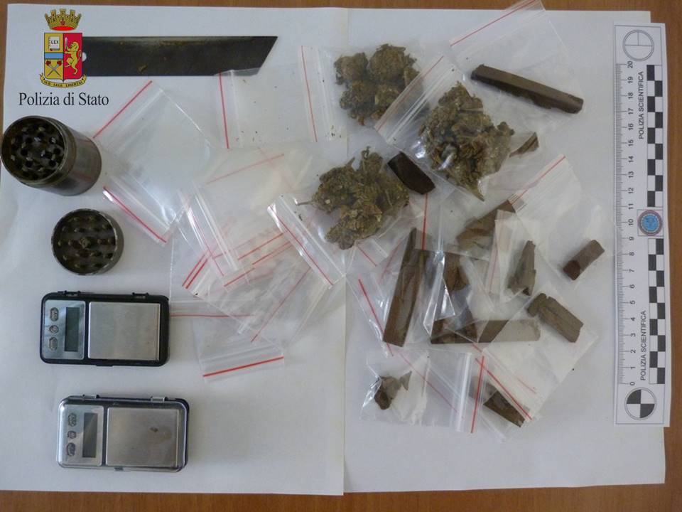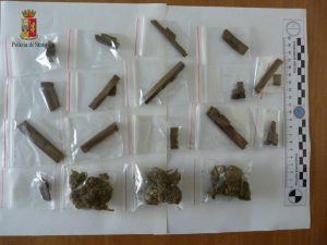 Nel corso della complicata operazione di polizia, i poliziotti, in un appartamento sito al terzo piano di una delle palazzine che compongono il complesso, hanno recuperato una busta di plastica con all’interno 15 dosi di hashish per complessivi 38 grammi, 3 involucri di marijuana, due bilancini di precisione e 135 euro in banconote di piccolo taglio.