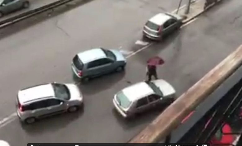 L’uomo, con il suo ombrello, – come si vede nel video apparso sulla pagina Facebook “Taranto è lui” – si è collocato al lato dell’imbocco per il sottopassaggio alla fine di Viale Magna Grecia, perché la stradina laterale era completamente allagata, anche per via di tombini aperti nascosti dalla pioggia.