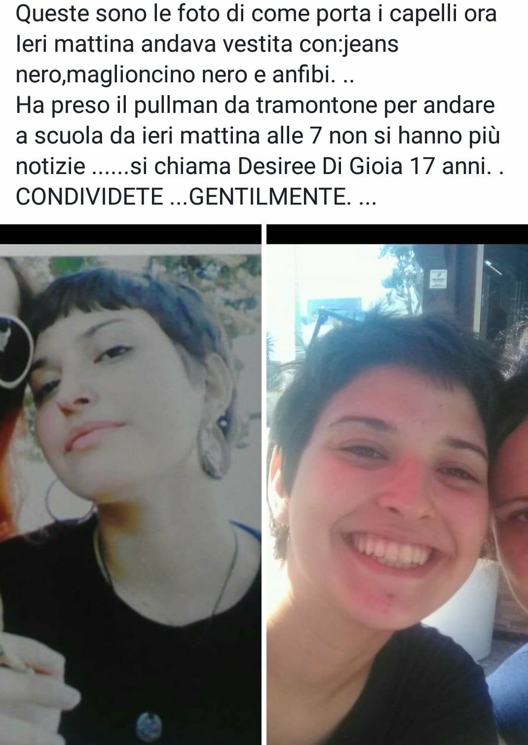 Scomparsa ieri mattina intorno alle ore 7:00, Desiree Di Gioia ha 17 anni, abita in zona Tramontone e ieri era diretta a scuola. Da allora i familiari non hanno più sue notizie.