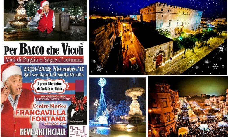 Francavilla Fontana, in provincia di Brindisi, l’antichissima città degli imperiali a 23 Km da Ostuni, a 16 da Manduria, la città del Primitivo Pugliese, a 35 da Brindisi e da Taranto, a pochi chilometri dalle cittadine della Valle d’Itria, servita da superstrade a doppia corsia, facilmente raggiungibile da ogni parte, è pronta ad aprire i PRIMI MERCATINI DI NATALE D’ITALIA che coincidono con il weekend di Santa Cecilia. La città sarà allestita dall’amministrazione comunale. Si inizia Giovedì 23 Novembre a mezzogiorno, si prosegue fino a Domenica 26 Novembre (da mezzogiorno) fino a mezzanotte. La città si è vestita a festa, con luminarie e sottofondi musicali natalizi, pronta ad esprimere la sua rinomata ospitalità. E’ la prima volta che nella città fondata dal Principe di Taranto Filippo D’Angiò, ma con insediamenti che risalgono a 3000 anni prima della nascita di Cristo, che si svolgerà PERBACCO CHE VICOLI, l’evento enogastronomico e le ambientazioni natalizie. L’organizzazione è quella della Events & Promotion di Roma diretta da Antonio Rubino Organizzazioni, con oltre trent’anni di esperienza ed organizzatore anche di Puglia Night l’evento enogastronomico svoltosi a Montecitorio. Perbacco che Vicoli ha avuto il suo inizio a Martina Franca, dove si è svolto per diversi anni, per poi approdare a Taranto lo sorso anno, e quest’anno a Francavilla Fontana per continuare nei prossimi anni in altre città, con l’obiettivo di promuovere non solo il territorio, ma soprattutto i sapori e l’artigianato attraverso i mercatini con il Patrocinio della Regione Puglia. E’ per questo che hanno preannunciato la loro presenza numerosi amministratori provenienti da altre città e non solo pugliesi. C’è già il tutto esaurito per quanto riguarda le strutture ricettive del posto e stanno arrivando prenotazioni in quelle limitrofe come Oria, Manduria, Latiano, Mesagne, Taranto e Brindisi. I mercatini di Natale saranno dislocati in diverse parti della città, ad iniziare da Via Municipio ai piedi del bellissimo Castello Imperiali, all’interno del quale si svolgeranno spettacoli di artisti di strada e dove cadrà LA NEVE ARTIFICIALE. Continueranno poi nelle strade pedonali del centro storico come Via Dante e Corso Roma. LO STREET FOOD con i tipici sapori natalizi con le migliori attività che proporranno diverse degustazioni, selezionate dall’Associazione PUGLIA GOURMET che allestirà anche un Ottagono nella bellissima Piazza della Chiesa Matrice dove ci sarà uno Show Cooking con un cuoco famosissimo che proporrà il primo “Orecchiette di semola di grano duro pugliese prime terre, con crema di cima di rapa, funghi cardoncelli, spirito contadino, pecorino canestrato pugliese” che verrà preparato anche in versione vegetariana e per i celiaci. Sempre nell’ottagono slow food spazio al panino con le bombette di Martina Franca e il capocollo di Martina Franca, oltre ai vini. Nella stessa piazza e in quelle attigue come Via Chiariste, per poi arrivare in Piazza Umberto, altri stand enogastronomici con dolce e salato: i salumi di Norcia, i provoloni impiccati, lo spiedino Filante, i provoloni della Murgia e del Gargano, la Mozzarella di Bufala, i panzerotti pugliesi con la novità allo stracotto d’asina,, le patatine fritte a spirale o le novità brandizzate, le Cazzatedde cegliesi farcite, le pettole servite in tutte le salse, gli arrosti con le carni selezionate murgesi, per poi arrivare ai dolci ad iniziare dal panettone artigianale di Mastro Gianni Parete che quest’anno si è classificato ai primi posti del più famoso concorso nazionale, ai cannoli ed alle creme di Sole di Puglia di Noci, le rinomate cioccolate della Dulciar che quest’anno presenterà anche i churros, poi i confetti ricci e la cupeta che trovano la loro origine a Francavilla Fontana dove sono diventati un marchio DOP, saranno eccezionalmente preparati dal vivo da Passiante, un artigiano da tre generazioni. Non mancheranno caldarroste e vini di cui il territorio è fertile.
