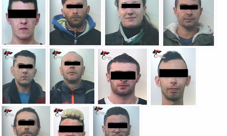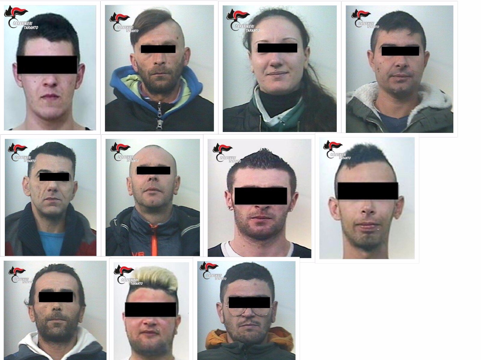 Alle prime ore del mattino di oggi, i Carabinieri del Comando Compagnia di Massafra, coadiuvati nella fase esecutiva dai militari del Reparto Operativo e delle Compagnie del Comando Provinciale di Taranto, con il supporto di un elicottero del 6° Elinucleo Carabinieri Bari Palese e di unità cinofile antidroga ed anti-esplosivo del Nucleo Carabinieri Cinofili di Modugno (Ba), hanno dato esecuzione, in Palagiano, Massafra e Taranto, a 11 provvedimenti cautelari (9 in carcere e 2 agli arresti domiciliari) emessi dal GIP del Tribunale di Taranto, d.ssa Vilma GILLI, su richiesta del Sost. Procuratore della Repubblica di Taranto, d.ssa Giovanna CANNARILE, nei confronti di altrettanti soggetti ritenuti responsabili, a vario titolo, di concorso in detenzione e spaccio di sostanze stupefacenti e detenzione e porto illegale di armi da fuoco.
