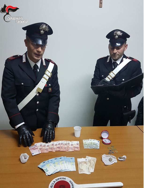Lo stupefacente sequestrato sarà inviato al Laboratorio di Analisi Sostanze Stupefacenti del Comando Provinciale Carabinieri di Taranto per essere sottoposto alle consueti analisi quali-quantitative finalizzate a stabilirne il principio attivo, mentre la somma di denaro rinvenuta è stata sequestrata, quale provento dell’attività illecita di spaccio di stupefacenti.