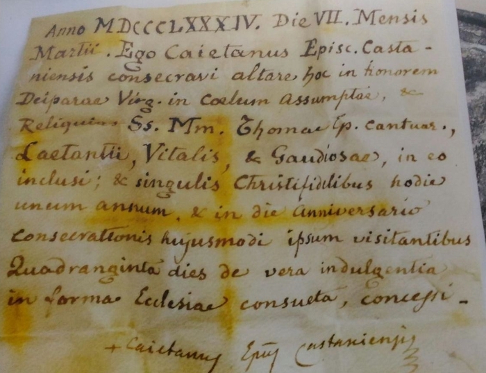 MOTTOLA – “Due reliquie di san Tommaso Becket sono state scoperte a Mottola durante lavori di restauro della chiesa Santa Maria Assunta. Si tratta di una teca sigillata in zinco di cinque centimetri per cinque e di un frammento osseo di san Tommaso. Quest’ultimo, di cui non si aveva traccia, è stato trovato in una pergamena datata 1884 e posta dal vescovo Bacile all’interno della pietra santa dell’altare. La teca, al momento, non è stata aperta. Nei giorni scorsi, dopo la scoperta, entrambe le reliquie sono state poste nel nuovo altare durante la consacrazione.