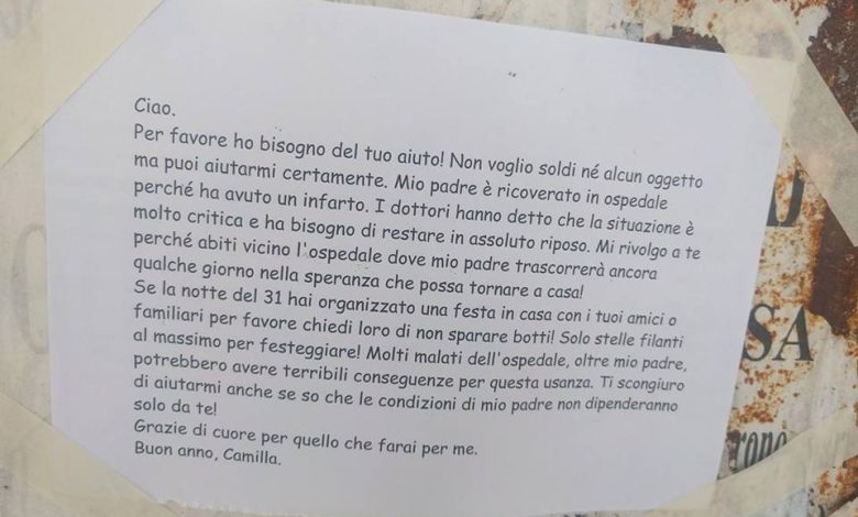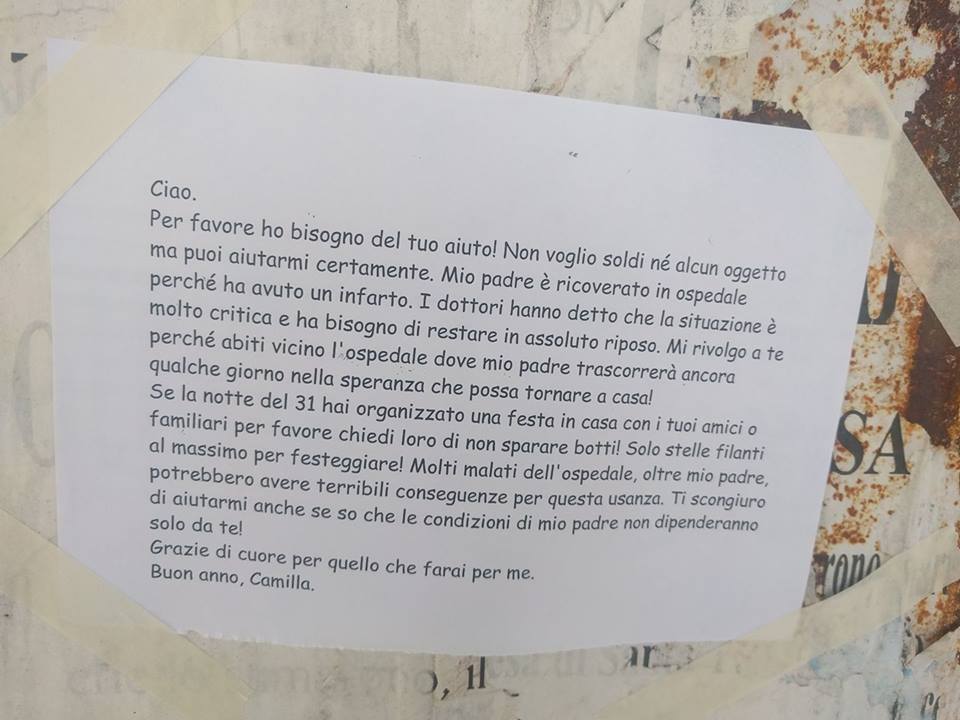 Se la notte del 31 hai organizzato una festa in casa con i tuoi amici o familiari per favore chiedi loro di non sparare botti! Solo stelle filanti al massimo per festeggiare! Molti malati dell’ospedale oltre mio padre, potrebbero avere terribili conseguenze per questa usanza. Ti scongiuro di aiutarmi anche se so che le condizioni di mio padre non dipenderanno solo da te! Grazie di cuore per quello che fai per me. Buon anno, Camilla”