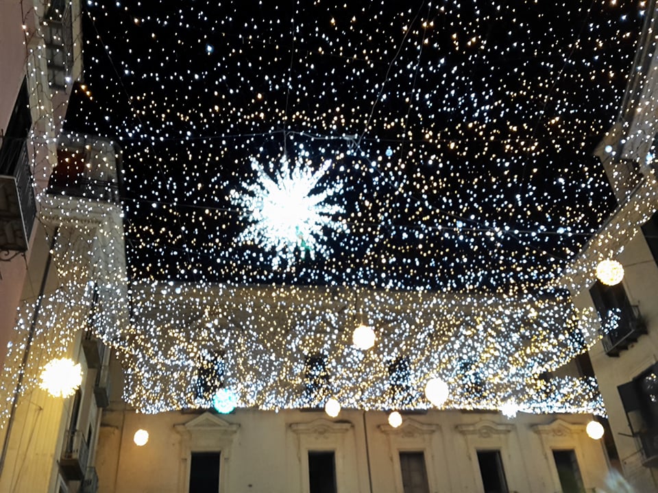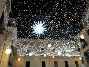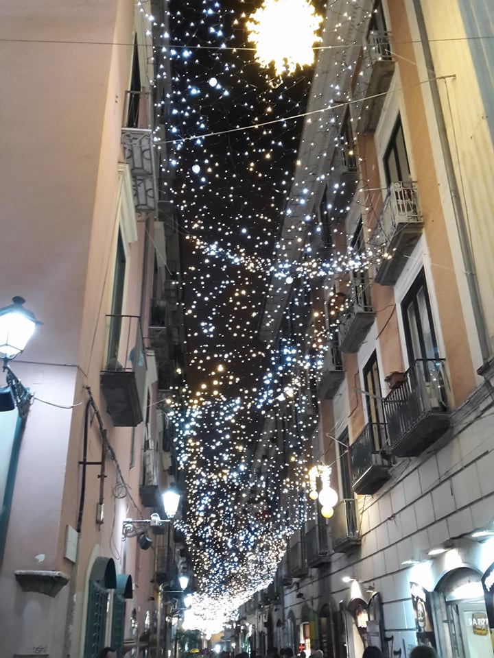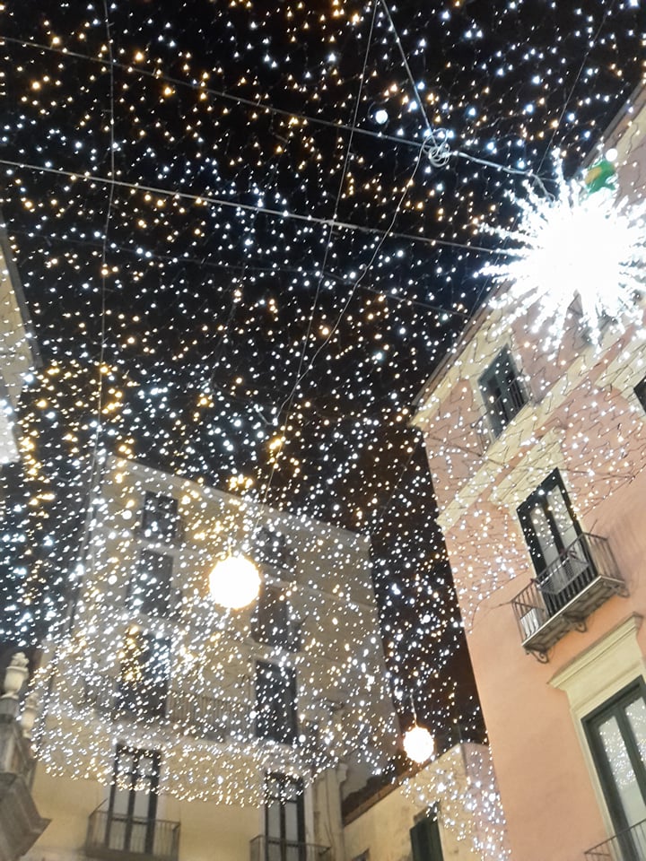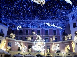 Partendo da Piazza Sedile di Portanova, al centro della quale ogni anno viene installato un grande abete addobbato con luci, un manto di luci dorate traccia un percorso tra i vicoli del centro storico che conduce ad un’altra piazza molto frequentata di Salerno, Piazza Sedile del Campo, dove quest’anno si apre agli occhi dei visitatori un’installazione luminosa di grande impatto visivo:un tripudio di luci dorate e di globi luminosi di vari colori e dimensioni traccia un universo di stelle, satelliti e pianeti del sistema solare.