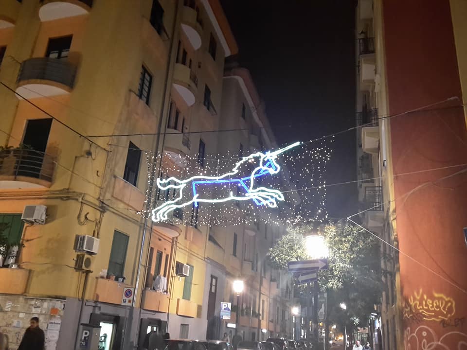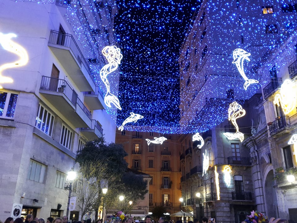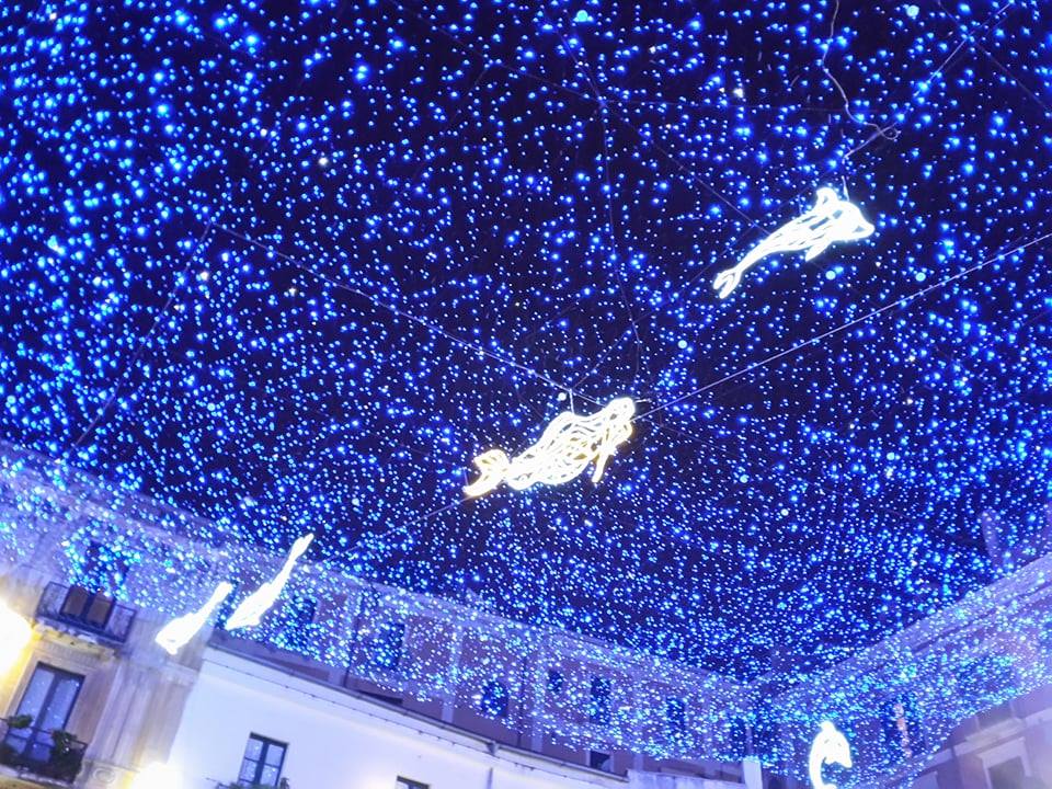 Nella splendida cornice della famosissima Piazza Flavio Gioia, tappa obbligata per i numerosi turisti che affollano la città, è situata una delle installazioni più spettacolari e suggestive: l’intera superficie è sovrastata da un reticolo di luci blu che simulano il fondale marino,mentre sullo sfondo si staglia l’imponente figura del Dio Nettuno, attorniata da conchiglie, delfini, sirene e varie creature marine.