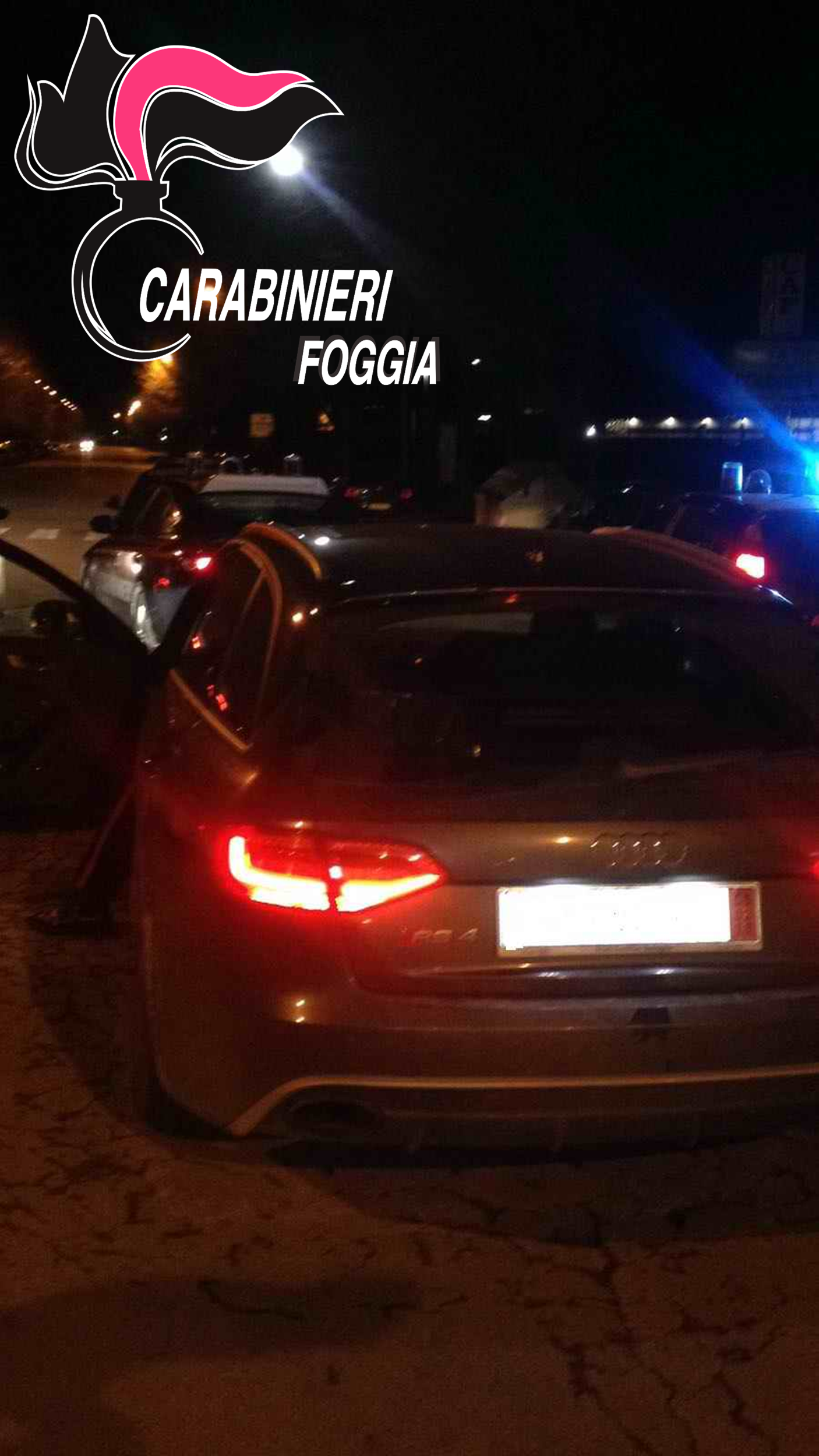 Nella notte di giovedi scorso una pattuglia dell’Aliquota Radiomobile del NORM della Compagnia cittadina nel corso del servizio di controllo del territorio aveva notato, in via Sant’Alfonso dei Liguori, un’Audi A4 Avant con targhe tedesche, ferma con i fari ed il motore accesi a fianco ad un’altra auto, una Passat. I militari hanno quindi raggiunto le due vetture per procedere ad un controllo, ponendosi di fronte alle stesse per impedire una loro eventuale partenza, notando solo allora che all’interno dell’Audi vi erano quattro soggetti tutti con il volto travisato da passamontagna. A questo punto i quattro malintenzionati, vistisi ormai scoperti e impossibilitati a fuggire con l’auto, ne sono letteralmente schizzati fuori e, favoriti dal buio, sono fuggiti a piedi imboccando strade diverse.