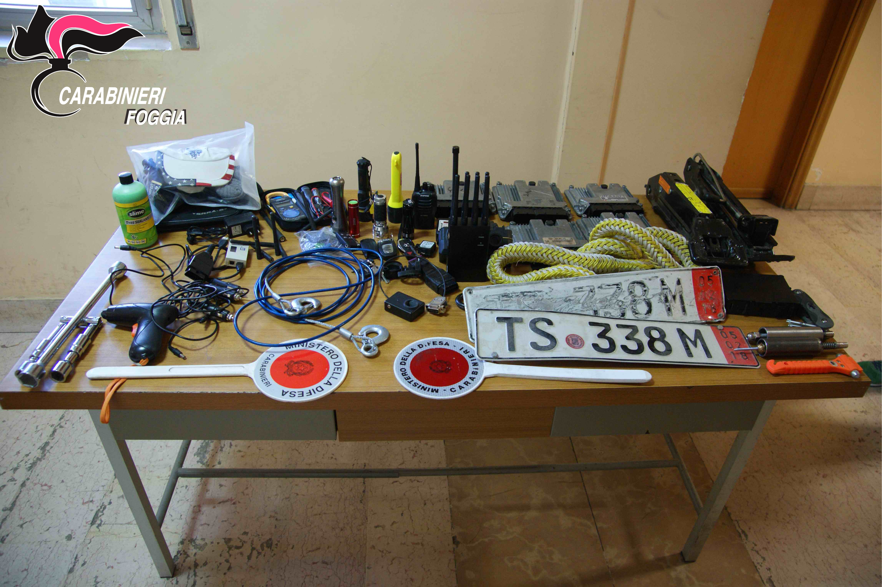 A questo punto l’equipaggio del Radiomobile non ha potuto che verificare che l’auto abbandonata era la potente AUDI A4 RS, da ben 450 cv, più volte segnalata in occasione di furti di autoveicoli, al cui interno hanno recuperato, oltre ad un disturbatore di frequenza radio “Jammer”, numerosissimi attrezzi da “officina”, utili allo scasso, diverse centraline “scodificate” di AUDI, BMW e VOLKSWAGEN, numerose chiavi di accensione, prive di codifica, per MERCEDES, RANGE ROVER e AUDI, e numerosi congegni elettronici per l’accensione dei veicoli più moderni e sofisticati.