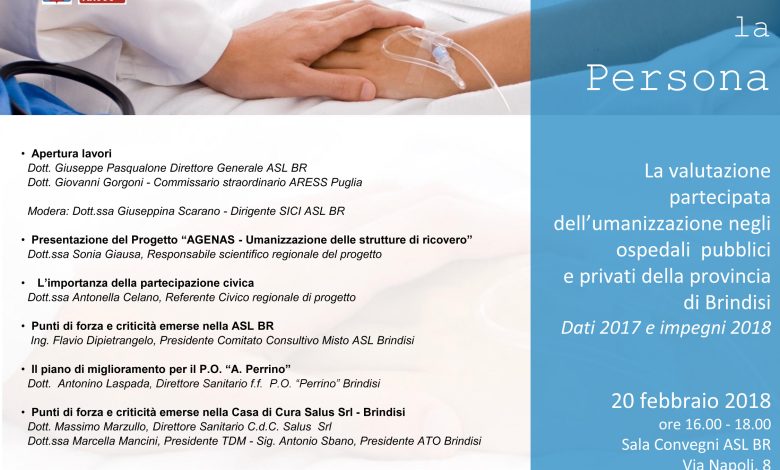 BRINDISI- Martedì 20 febbraio 2018 dalle 16.00 alle 18.00, presso la sala Convegni della ASL BR in via Napoli a Brindisi, verranno presentati i risultati della ricerca “La cura e la persona: la valutazione partecipata dell’umanizzazione negli ospedali pubblici e privati della provincia di Brindisi”.