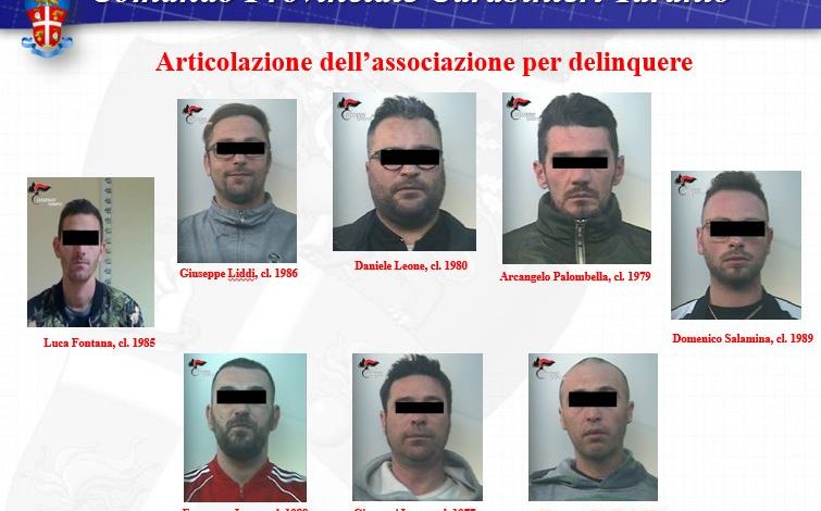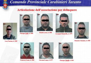 In sintesi, nell’ambito del procedimento, in cui sono indagate complessivamente otto persone, il G.I.P. di Taranto ha emesso O.C.C. a carico di tutti per il reato di associazione per delinquere (art. 416 c.p.) finalizzata al compimento dei delitti di estorsione (art. 629 c.p.) con l’aggravante di aver compiuto gli atti criminosi in numero di due e più persone ed a carico di 3 persone nonostante la misura di prevenzione della sorveglianza speciale (art. 71 D.Lgs. 159/2011) disponendo la custodia cautelare in carcere a carico di 5 soggetti e di 3 agli arresti domiciliari come meglio specificato nell’allegato elenco. Gli arrestati in carcere sono stati tradotti alla casa circondariale di Taranto.