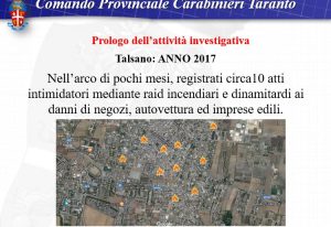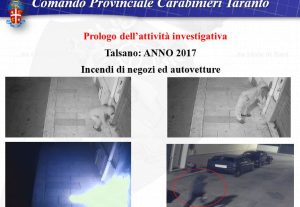L’indagine conclusa con l’odierna operazione, è stata avviata dall’Aliquota Operativa della Compagnia Carabinieri di Taranto, a seguito di una serie di danneggiamenti ed incendi occorsi durante lo scorso anno nei quartieri e frazioni di Talsano, Lama, San Vito e nella vicina Leporano, in danno di imprenditori edili e commercianti. In dettaglio, si tratta di circa una decina di incendi di autovetture ed esercizi commerciali e del rinvenimento di un ordigno inesploso a Talsano, nei pressi della sede di un’impresa edile.