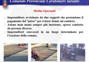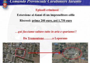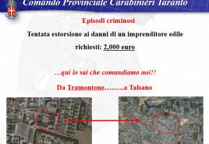 Le indagini, avviate nel settembre 2017 dai Carabinieri dell’Aliquota Operativa della Compagnia di Taranto e coordinate dalla locale Procura, hanno fatto luce su un gruppo criminale operante a Taranto, con epicentro il rione “Tramontone” della borgata Talsano, dedito ad estorsioni in danno di imprese, promosso, diretto e costituito da soggetti originari e residenti nel capoluogo ionico (tutti con precedenti penali anche per reati similari ed associativi, alcuni dei quali già colpiti da misure di prevenzione personali ancora in atto).