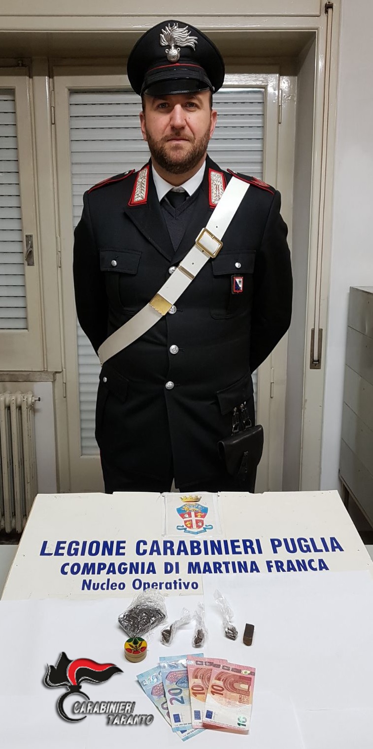MARTINA FRANCA – I Carabinieri dell’Aliquota Operativa del N.O.R. della Compagnia di Martina Franca hanno arrestato, in flagranza del reato di detenzione a fini di spaccio di sostanze stupefacenti, un 37enne, incensurato, del posto.