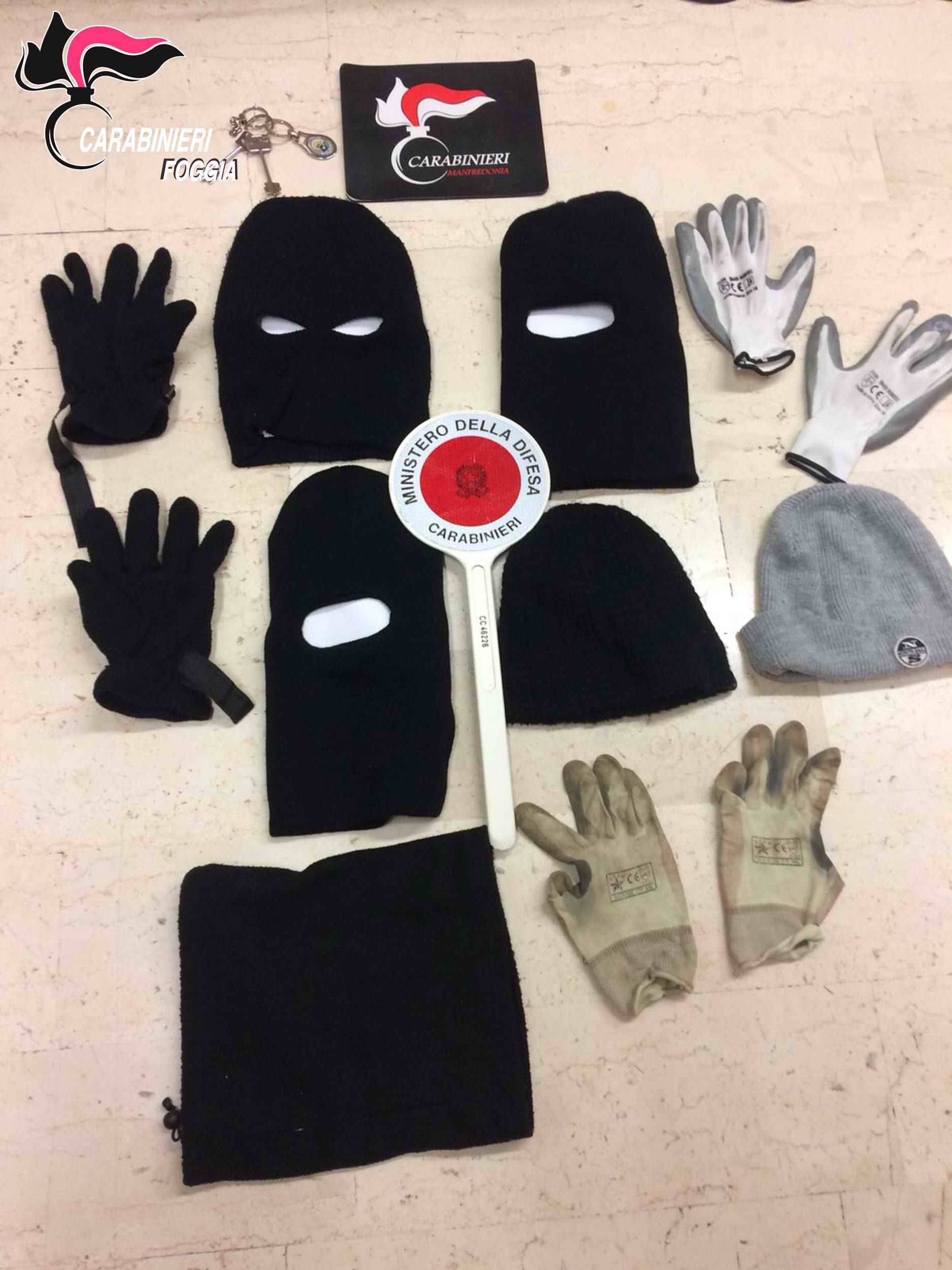 I Carabinieri hanno inoltre recuperato, oltre al cacciavite usato per forzare la porta, anche un sacco, lanciato dalla macchina durante la fuga, contenente passamontagna e guanti, portati per evitare di lasciare impronte.