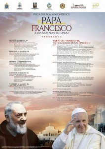 Giunto a San Giovanni Rotondo, Papa Francesco ha salutato e benedetto i pazienti ammalati presenti sul piazzale antistante l’ospedale “Casa Sollievo della Sofferenza”, e ha visitato il “Poliambulatorio Giovanni Paolo II”dove ha incontrato i bambini del reparto di Oncoematologia Pediatrica, scattando selfie e firmando magliette e autografi per i suoi piccoli ammiratori. In seguito,dopo aver salutato la comunità dei Frati Cappuccini,si è soffermato in preghiera dinanzi alla teca di cristallo dove è custodita la salma di San Pio, posta per l’occasione dinanzi all’altare del santuario “Santa Maria delle Grazie”.
