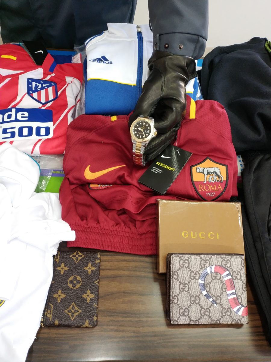 La preliminare attività investigativa ha consentito di raccogliere comprovanti indizi di reità che hanno permesso l’effettuazione di una perquisizione domiciliare delegata dalla Procura di Taranto nel corso della quale sono stati rinvenuti oltre 100 pezzi abilmente contraffatti di completi di calcio di squadre italiane ed estere riportanti note marche (ADIDAS, NIKE, PUMA), unitamente a portachiavi e portafogli (GUCCI, LOUIS VITTON), ed un orologio di marca ROLEX, di discreta fattura, ma anch’esso risultato non originale.