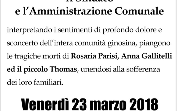 “Premesso che il giorno 21 marzo scorso, in occasione di un gravissimo incidente stradale hanno perso la vita tre cittadini di Ginosa e, precisamente Rosaria Parisi, Anna Gallitelli ed il piccolo Thomas Gallitelli;