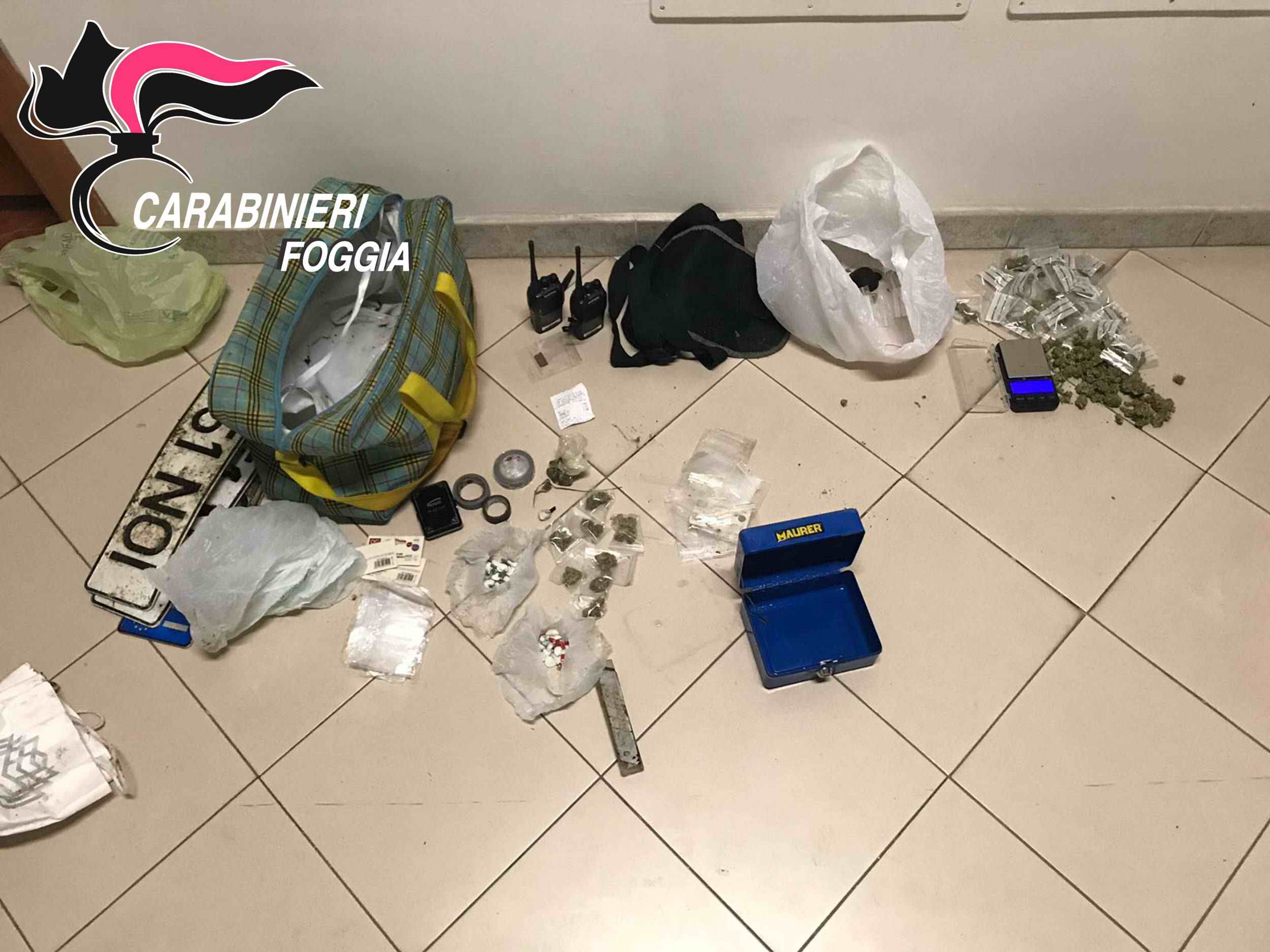 I due a finire in manette sono stati CIRULLI ALESSANDRO, cl. ’87, pregiudicato e sorvegliato speciale di P.S. con obbligo di soggiorno nel comune di residenza, e S. O., cl. ’90, incensurato, entrambi cerignolani. I due, che alla vista dei militari avevano gettato una sacca nella campagna adiacente al palazzo dove vive il Cirulli, sono stati poi bloccati nella cantine dello stabile mentre tentavano di occultare della marijuana. Recuperata in seguito la sacca di cui si erano appena disfatti, vi è stato trovato altro stupefacente, oltre a tutto il materiale necessario per il confezionamento e la pesatura dello stesso. In totale sono stati sequestrati 65 grammi di marijuana, 27 di hashish e 16 di cocaina. Il Cirulli, inoltre, è stato trovato in possesso di una somma di denaro contante di circa 2.000 euro, suddivisa in banconote di vario taglio, che lo stesso dichiarava essere i suoi risparmi di oltre un anno, stipato all’interno di un salvadanaio. Dalla stessa sacca, inoltre, sono anche state recuperate tre targhe rumene, che da accertamenti sono poi risultate a Cerignola nel 2014. Entrambi gli arrestati, che risponderanno del reato di detenzione ai fini di spaccio di sostanze stupefacenti e ricettazione, su disposizione del P.M. di turno sono stati sottoposti agli arresti domiciliari.
