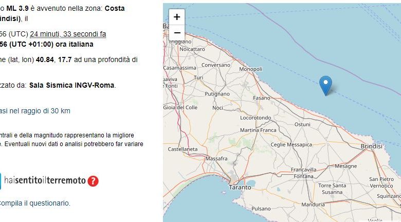 Una forte scossa di terremoto ha colpito la Puglia alle 00:32 della notte. L’epicentro della scossa s’è verificato nel mare Adriatico, appena al largo dal litorale sulla costa di Ostuni, tra Monopoli e Brindisi. La scossa, in base ai dati diffusi dall’INGV, è stata di magnitudo 3.9, s’è verificata a 27,3km di profondità ed è stata avvertita su gran parte della Regione, specie nei settori centro/meridionali.
