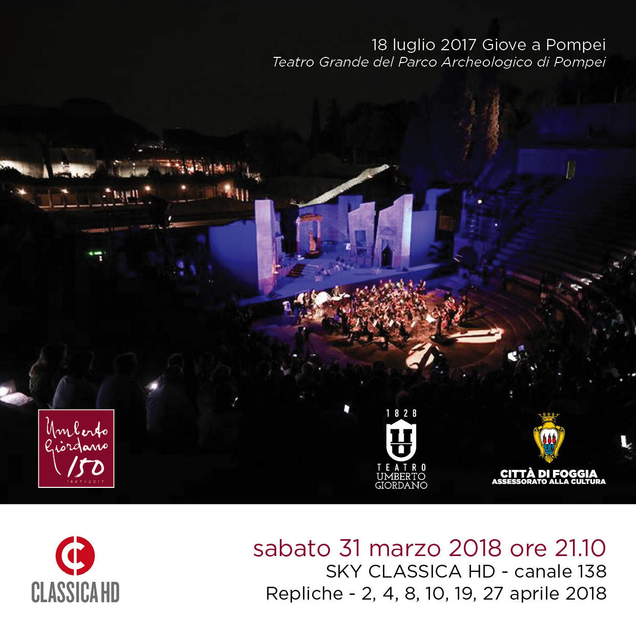 Il canale satellitare SKY Classica HD (il 138 del bouquet di Sky), noto ed apprezzato soprattutto tra gli appassionati di Musica (soprattutto classica) e di Cultura, il prossimo 31 marzo, in prima serata (ore 21.10), trasmetterà l’operetta di Umberto Giordano“Giove a Pompei”, messa in scena lo scorso 18 luglio presso il Teatro Grande all’interno del Parco Archeologico di Pompei.