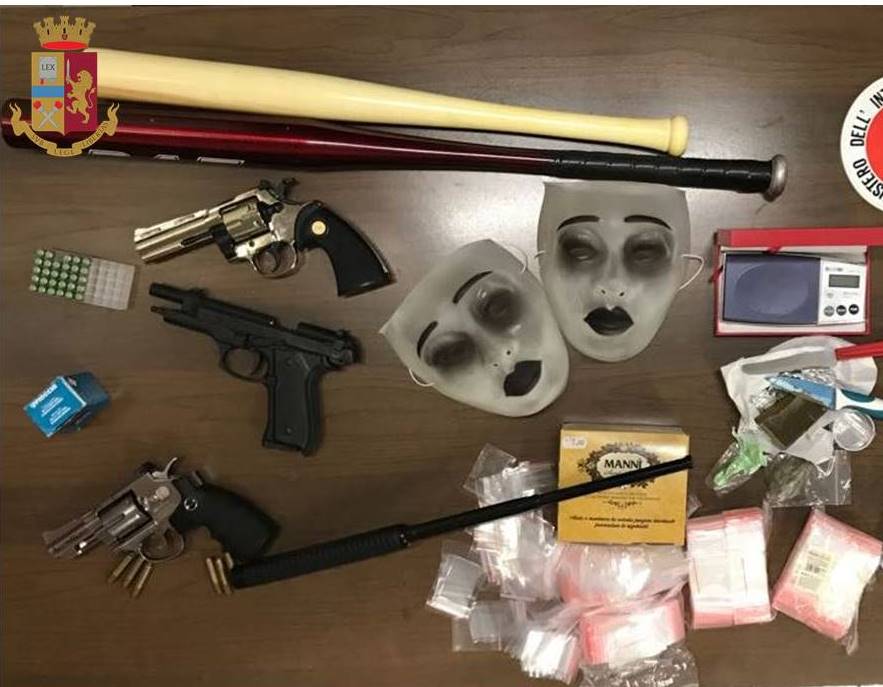 Nel proseguimento dell’ispezione, in camera da letto sono state anche recuperate tre riproduzioni di pistole tutte prive del previsto tappo rosso, circa 70 cartucce di vario calibro, 2 mazze da baseball un in metallo e l’altra in legno, uno sfollagente telescopico in acciaio e due maschere bianche in plastica. Il figlio della padrona di casa, LA VOTA Antonio, pluripregiudicato grottagliese di 25 anni che non era presente al momento del controllo , è stato rintracciato nella tarda mattinata e dopo le formalità di rito tratto in arresto.