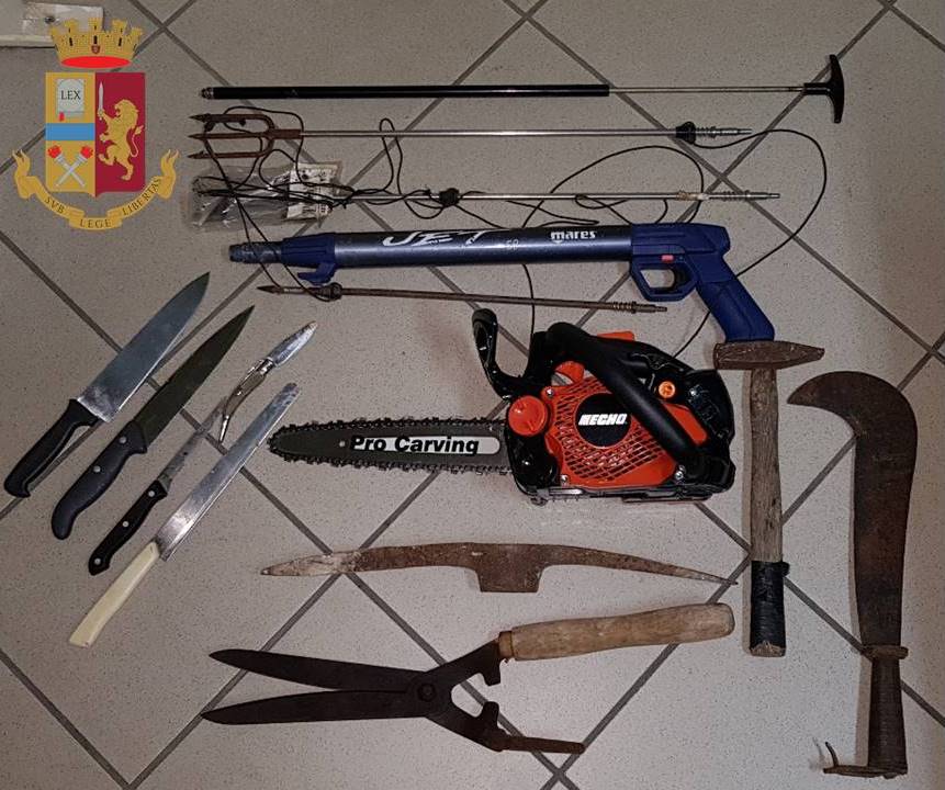 All’arrivo dei Vigili del Fuoco, che hanno aperto una saracinesca attigua all’abitazione, gli agenti sono entrati nell’immobile e con non poche difficoltà, congiuntamente ad altri operatori che sono intervenuti dal terrazzo adiacente , sono riusciti ad immobilizzare il soggetto prima che potesse reagire. Lo stesso, fortemente agitato, è stato immediatamente sedato dai sanitari e trasferito presso il reparto di psichiatria dell’ospedale Moscati di Taranto dove veniva ricoverato. Nel frattempo gli uomini del Commissariato di Manduria hanno proceduto al sequestro di varie armi da taglio presenti in abitazione, nonché di una motosega e del fucile da sub con varie aste provviste di fiocina ed arpione. Inoltre, gli operatori hanno notato un particolare inquietante: una pentola con dentro dell’olio, senza alcunché da cucinare, era stata da poco posizionata sulla fiamma del fornello.