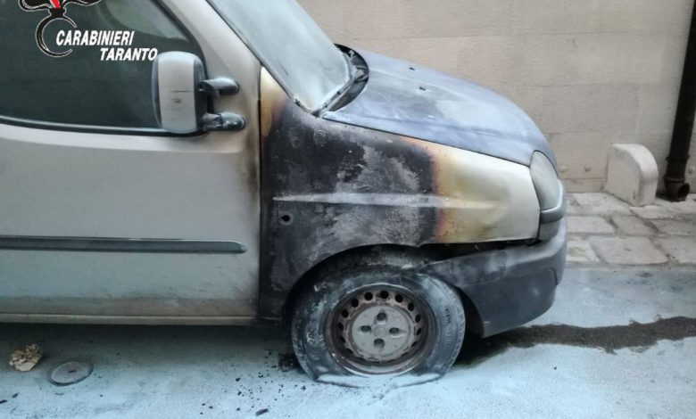 I militari, mentre transitavano in via Gigli del centro abitato di Ginosa, dopo aver udito uno scoppio, notavano una Fiat Doblò lì parcheggiata avvolta dalle fiamme e una Alfa Romeo 156 allontanarsi a forte velocità. I Carabinieri, dopo aver spento prontamente le fiamme con l’estintore in dotazione all’automezzo di servizio ed accertato che non si trattava di un’autocombustione, si sono immediatamente attivati per identificare il proprietario della 156, che veniva rintracciato, poco dopo, presso la sua abitazione in Laterza.